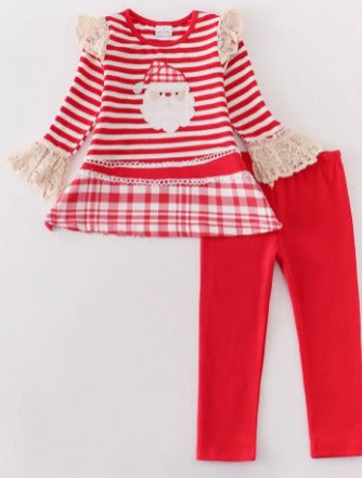 This girls Santa stripe romper brings holiday cheer with its bright red and white striped design, complemented by delicate lace and ribbon details on the legs. A charming Santa appliqué adds a festive touch to the front. Made from a blend of 97% cotton and 3% spandex, it offers softness and stretch for comfort throughout the day. Designed to maintain its shape and resist wrinkles, this romper is perfect for busy playdates, family gatherings, and holiday celebrations. Easy to care for, simply wash cold on a gentle cycle and tumble dry low to keep it looking fresh and festive all season long.