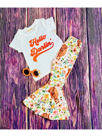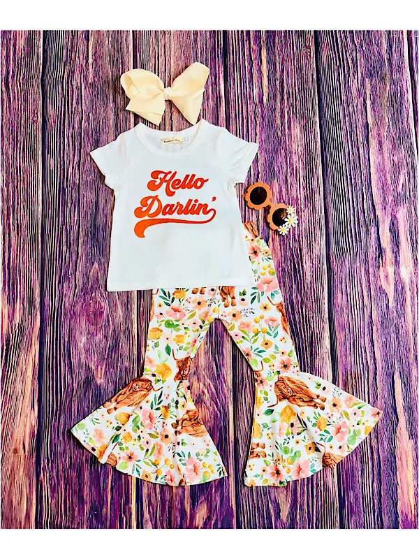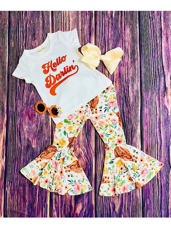 HELLO DARLIN wording on white background & short sleeve cut. Bottoms feature bull & light pink floral print w/flare legs. Soft, breathable, stretchy, and comfortable fabric. Adorable western outfit. Material: Polyester & Spandex. Includes: Top & Bottoms.