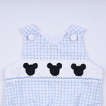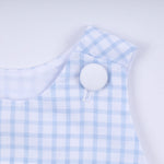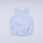 Adorable bubble romper featuring a charming character design set against classic gingham checks. Hand-smocked detailing adds texture and vintage-inspired appeal, while the relaxed bubble silhouette keeps little ones comfortable and stylish. Perfect for playdates, family outings, or everyday wear. The soft blue palette complements any wardrobe, making this a versatile piece that parents and kids will love.