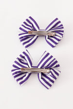 Add some quirky charm to your hair with this playful purple stripe piggie hair bow. Its unique design will make you stand out from the crowd, while keeping your hair stylishly in place. Perfect for any occasion, this bow ties together the perfect look with a touch of fun.