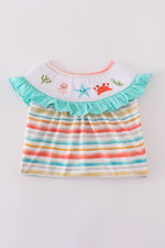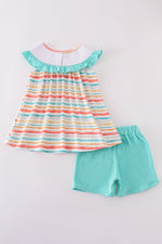 Get ready to rock the summer in this colorful smocked shorts set! Featuring adorable marine creature embroidery on a rainbow stripe pattern. Stand out from the crowd with this unique and playful outfit. Perfect for beach days, festivals, or just hanging out with friends. Dive into style with this one-of-a-kind set!