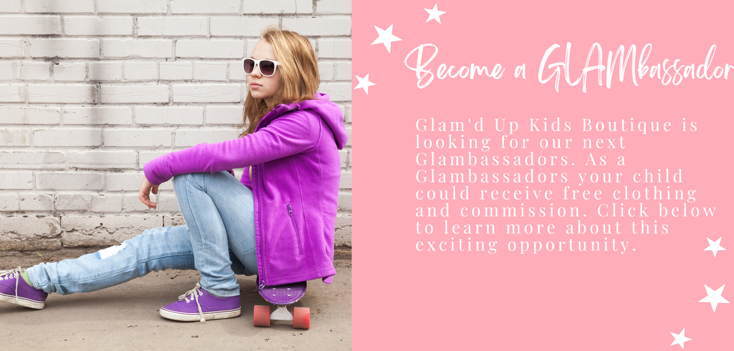 Does your child have what it takes to become a Glambassador? As a Glambassador you can earn commission as well as free clothing. Fill out the form below to learn more and in the comment section drop your child's name and size. Let's get Glam'd Up!