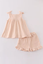 Add a pop of sunshine to your wardrobe with our Apricot Muslin Bow Shorts Set. The light and airy muslin fabric will keep you cool while the cute bow design adds a playful touch. Perfect for summer days spent lounging or a fun day out with friends. Get yours now!