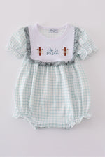 Add a pop of quirk to your wardrobe with our Blue He Is Risen Embroidery Bubble! This playful piece features bold blue embroidery that's sure to turn heads. Show off your unique sense of style with this one-of-a-kind statement piece. (Hint: It's perfect for Easter too!)