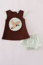 This charming brown bloomer set features an adorable duck applique, perfect for adding a playful touch to your little one’s wardrobe. Soft and comfortable, it’s designed for easy movement and all-day fun. Ideal for sunny days and casual outings, this set brings a cute and cheerful vibe to any outfit.
