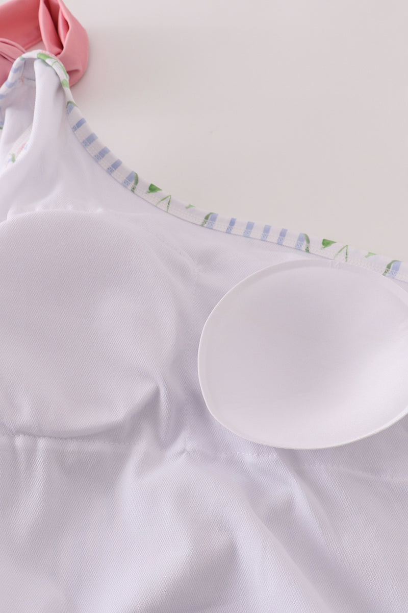 Dive into summer with our playful Floral Stripe Bow Swimsuit! This adult swimsuit combines eye-catching floral patterns with stylish stripes and a charming bow detail. The UPF50+ protection keeps your skin safe while you splash around, giving you peace of mind during all your sunny adventures. Perfect for beach days, pool parties, or tropical getaways!