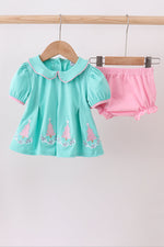 Celebrate the holiday spirit with this playful Green Christmas Tree Embroidery Bloomer Set. Featuring charming embroidered Christmas trees, this set adds festive cheer and cozy comfort for little ones. Perfect for holiday photos and seasonal fun, it combines cute style with easy wearability.
