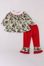Bring a touch of festive fun to your wardrobe with this green holly floral smocked ruffle pants set. The playful smocked top pairs perfectly with ruffled pants, creating a charming and comfortable outfit that’s perfect for holiday gatherings or cozy days at home. Embrace the season in style with this lively and cheerful set.