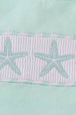 This playful green shorts set features charming starfish embroidery and a comfortable smocked waistband, perfect for sunny days and seaside adventures. Soft and breathable, it keeps your little one cool while adding a splash of fun to their wardrobe.