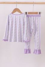 Slip into cozy charm with this Lavender Floral Ruffle Bamboo Pajamas Pants Set. Crafted from soft bamboo fabric, it’s gentle on your skin and delightfully breathable for all-night comfort. The playful floral pattern paired with sweet ruffle details adds a fun, feminine touch to your bedtime routine. Perfect for lounging or dreamy sleep, this set makes relaxation feel effortlessly stylish.