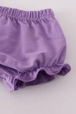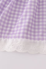 This charming lavender gingham bloomer set features delicate ribbon lace embroidery, adding a sweet and playful touch to your little one’s wardrobe. Perfect for sunny days and special occasions, it combines comfort with adorable style for endless twirling and fun.