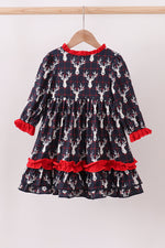 Step into whimsy with this navy deer print ruffle dress that blends playful charm with effortless style. The lively deer pattern adds a touch of forest fun, while the fluttering ruffles bring movement and personality to every step. Perfect for sunny days or casual outings, this dress makes a delightful statement without trying too hard.