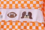 Adorable checkered top featuring a charming puppy bow embroidery in vibrant orange Tennessee tones. Perfect for adding a whimsical touch to any wardrobe, this playful piece combines classic gingham styling with cute animal-inspired details. Ideal for casual outings, playdates, or whenever you want to showcase your fun-loving personality. A delightful choice for those who appreciate quirky, heartwarming fashion.