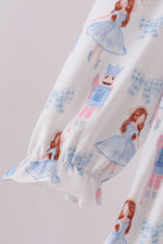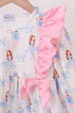 This pink bow nutcracker ruffle dress brings whimsical charm to any occasion. Featuring delicate ruffles and a bold bow accent, it’s designed to add a playful touch to your little one’s wardrobe. Perfect for festive events or dress-up fun, this dress combines comfort with a delightful, storybook-inspired look.