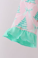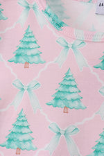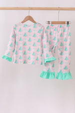 Get cozy and cute this holiday season with our Pink Christmas Tree Ruffle Pajama Set. Featuring playful ruffles and a festive pink hue adorned with charming Christmas tree patterns, this set makes bedtime feel like a celebration. Perfect for lounging or holiday morning fun, it brings a joyful sparkle to your sleepwear collection.