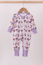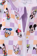 Premium purple character print checkered bamboo romper