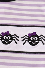 Celebrate Halloween in style with this playful purple bubble dress featuring charming spider embroidery, bold stripes, and flirty ruffle details. Perfect for adding a fun, festive touch to your wardrobe while keeping comfort and whimsy in mind.