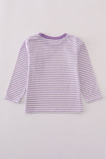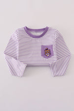 Show your team spirit in style with this playful purple top featuring bold LSU embroidery and a trendy stripe design. Perfect for game days or casual outings, it adds a fun pop of color while keeping you comfy and spirited.
